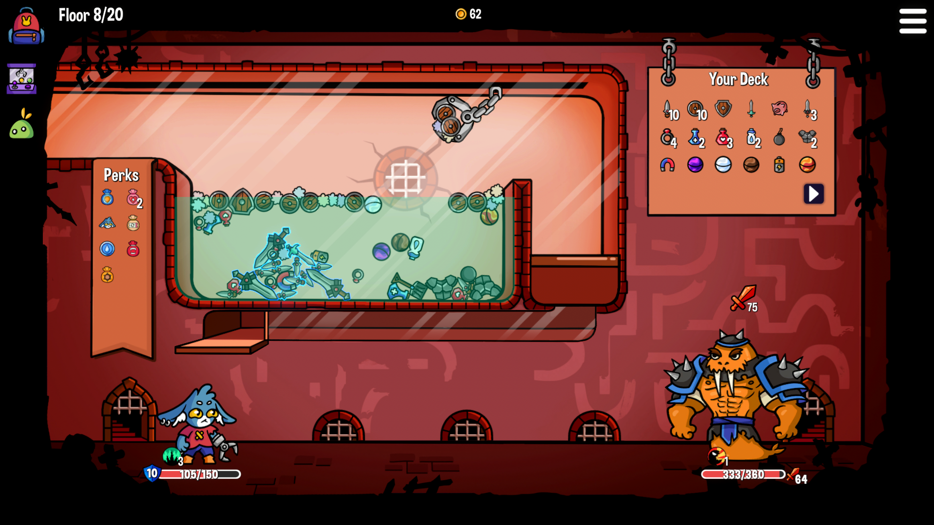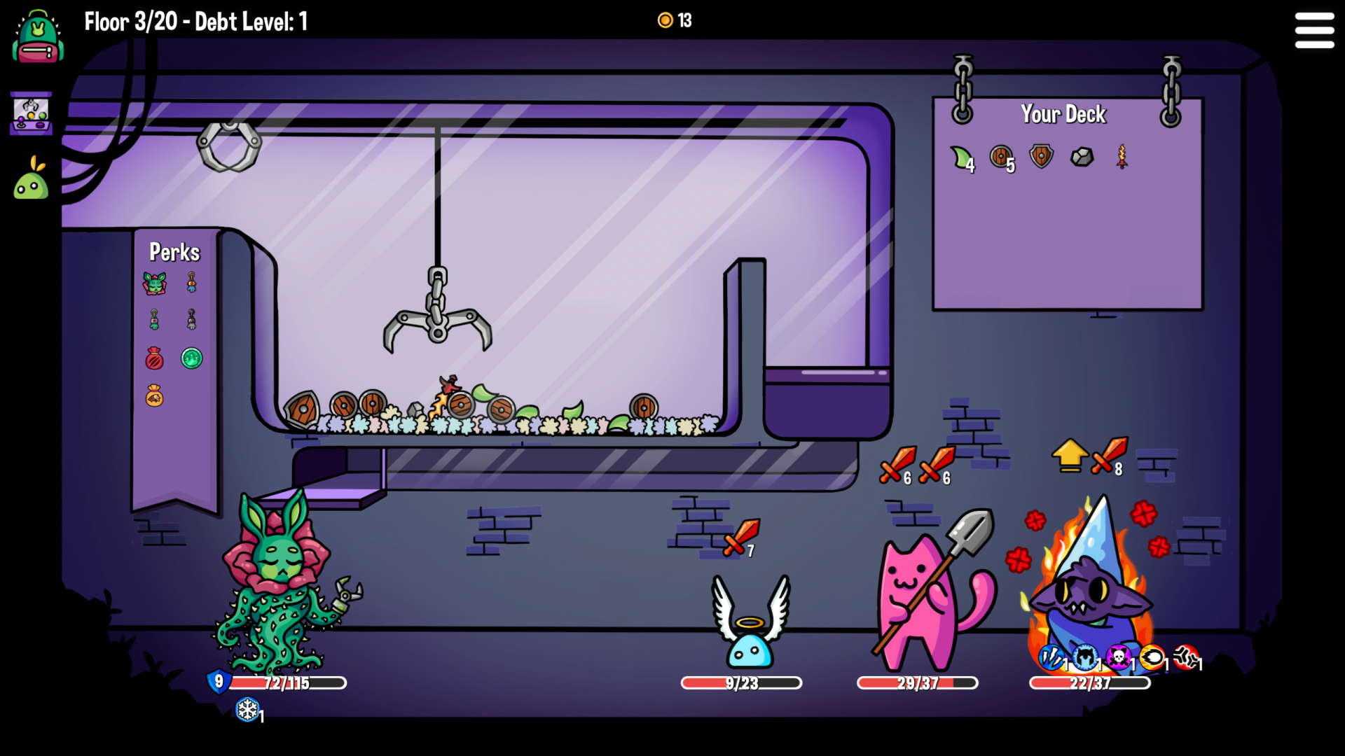 Dungeon Clawler is a Roguelike Claw Machine Deckbuilder. Build your unique deck, fight enemies by grabbing weapons and items from a claw machine and find special artifacts that help you on your quest to reclaim something you lost... Aim carefully to claw your way through this dungeon!